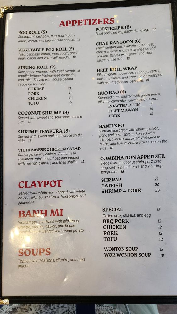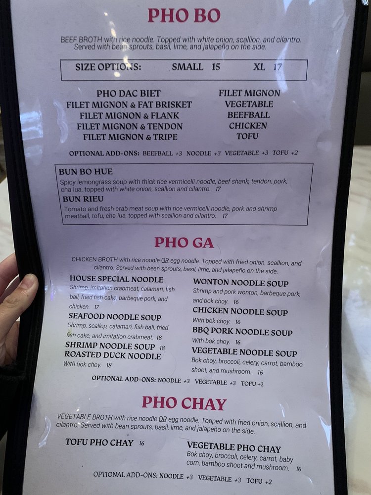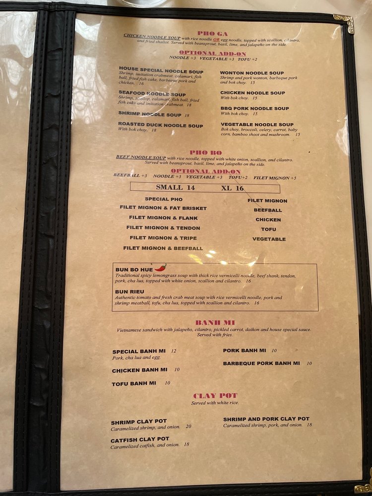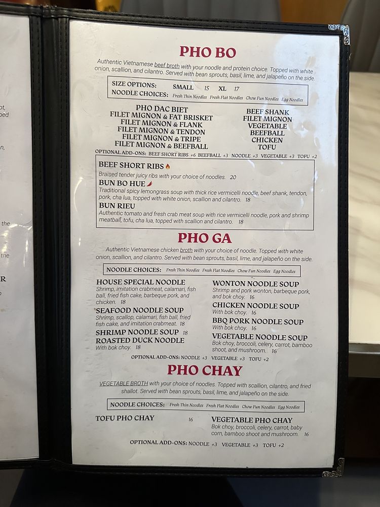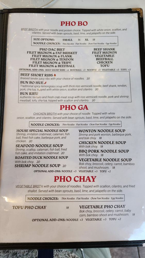 Introducing the menu at Pho Tasty in Davis, CA, where the ambiance is cozy and the food is top-notch. Start your meal with appetizers like Spring Rolls or the Appetizer Combo for a varied taste experience. Indulge in flavorful soups like Wonton or Wor Wonton Soup packed with fresh ingredients. The highlight of the menu is the Pho Bo selection, ranging from Filet Mignon to Vegetable Pho, catering to all preferences. Customers rave about the delicious seafood pho, praising the well-balanced broth and perfectly cooked noodles. The Bun Bo Hue is a must-try for those seeking a spicy kick. With a chill vibe, Pho Tasty offers a welcoming environment for all diners. Experience the culinary delights at Pho Tasty and savor the authentic flavors of Vietnamese cuisine.